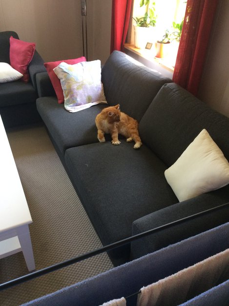 Hun er løveklippet. Det står «ID» i øret hennes.