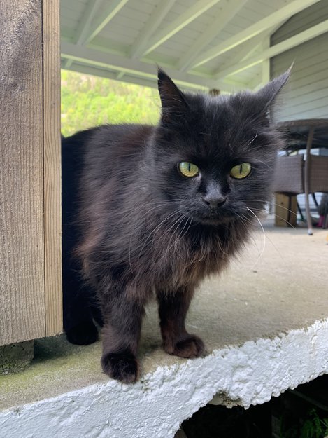 Liten, svart langhåret hukatt. Har et hakk og id i øret.
