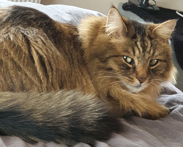 Hadde kortere pels i ett felt på "rygg" vs foran hofte. Har nok vokst ut helt igjen nå. Kan være veldig trygg, oppsøkende og sosial. Er _veldig_ god til å jakte. Tigerstriper på ben, mer sjateringer på kropp og rygg. Svart felt langs ryggrad og brunspraglet ellers.