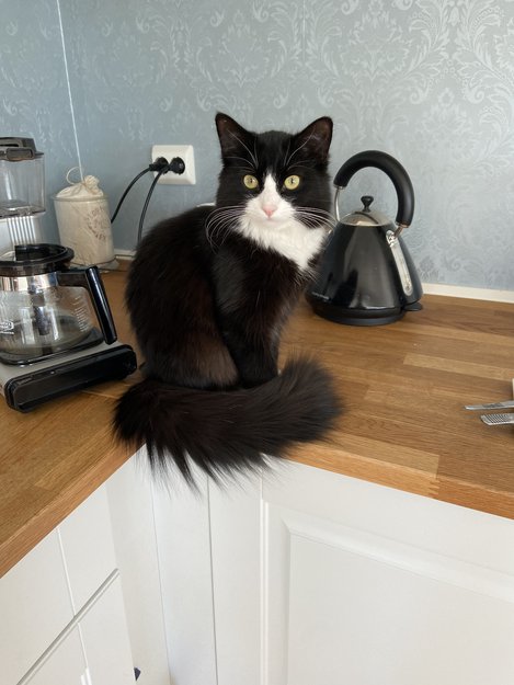 Mest sort. Hvit i ansiktet og hals, et par hvite flekker på magen og hvite poter. Nysgjerrig og litt forsiktig av seg. Ca. 1 år gammel.