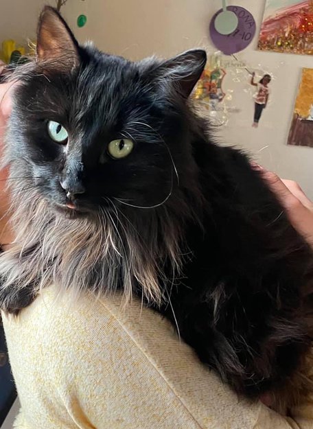 Svart, langhåret kastrert hannkatt. Noe brunt i det svarte, og gråbrun «løvemanke», med grå pels på magen. Stor buskete hale. Litt sky, men veldig kjærlig av seg.