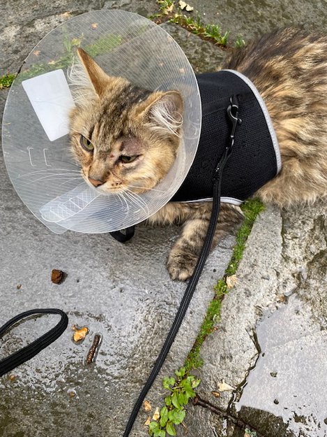 Stripe har kommet seg ut gjennom et vindu. Han er under behandling for et sår rundt øyet og har derfor skjerm, og skal egentlig være inne eller i bånd ute.
