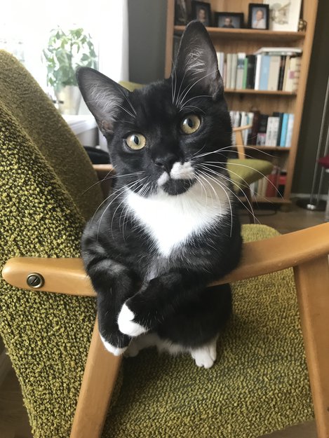 Dennis er hvit på brystet og på potene. Han er sky og ikke vant til å være ute. Han er 1 år og 4 mnd.