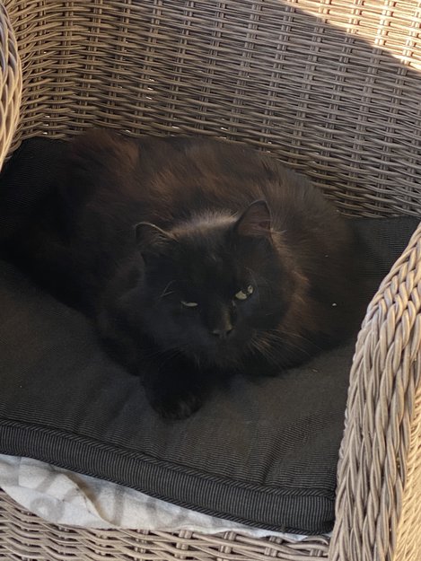 Helsvart langhåret katt har holdt til rundt huset vårt. Forsøker å komme seg inn for å spise av vår katt sin mat. Virker å være noe tynn.