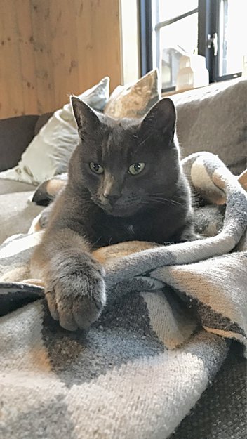 5,5 kg hannkatt med kort, grå pels.