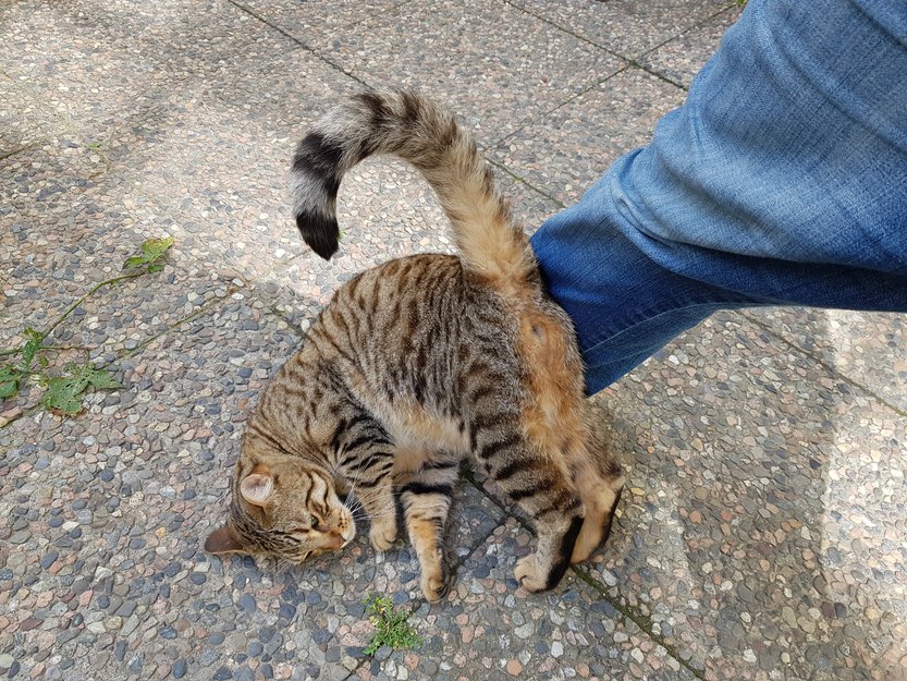 Relativt stor i beinbygningen (kanskje 5-6 kg), i godt hold. Virker rolig.