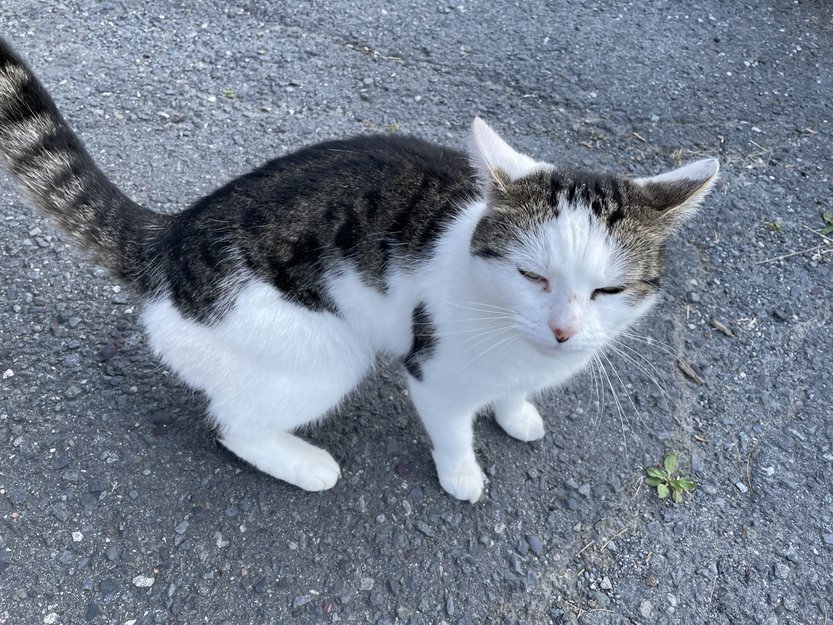 Hvit og gråbrunspraglete katt har hengt her i veistubben siste dager/uke. Tydelig tørst, sulten og selskapssyk!