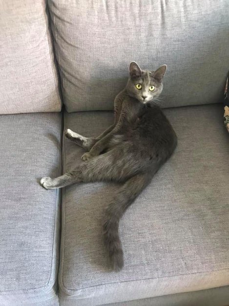 Grå kort pels, gule øyne. Litt lysere rundt nesen. Litt stripete på halen, men det kommer an på lysforholdene. Er vanligvis redd for fremmede og ikke særlig kosete, men bruker å komme fram når hun hører stemmene våre.