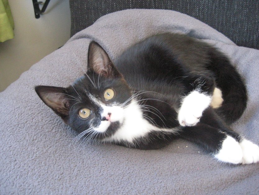 Hun har fire hvite sokker på potene. hvit på brystet, som blir smalere og smalere jo lengere under magen den kommer, hvit rundt snute og munn, som igjen føre til en smalere stripe opp i pannen, eller er hun helt svart. Hun prater mye, med oss som kjenner henne, kosete på gulvet, men liker ikke å ligge på fanget. Veldig tollmodig og snill. DYPT SAVNET!