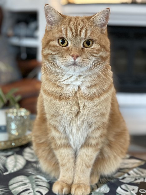 Gule øyne. Rødoransje og tabbymønstret med lyse felt under haken.