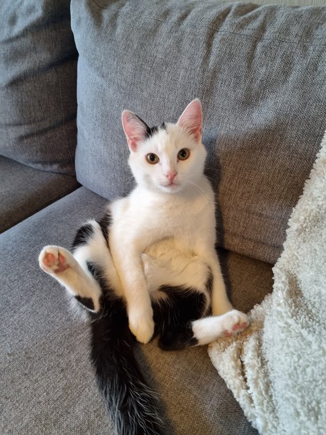 svart og hvit. svart på den ene øret. veldig lang hale😊
