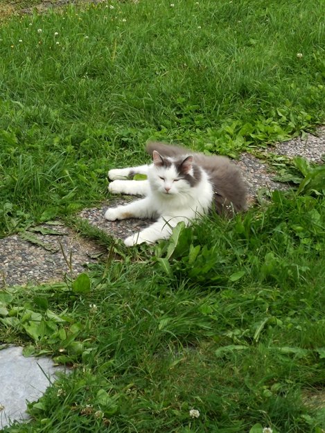 Fått besøk av en ganske stor, rund grå og hvit langhåret katt. Mye klumper i pelsen og veldig sulten, men ikke tynn.