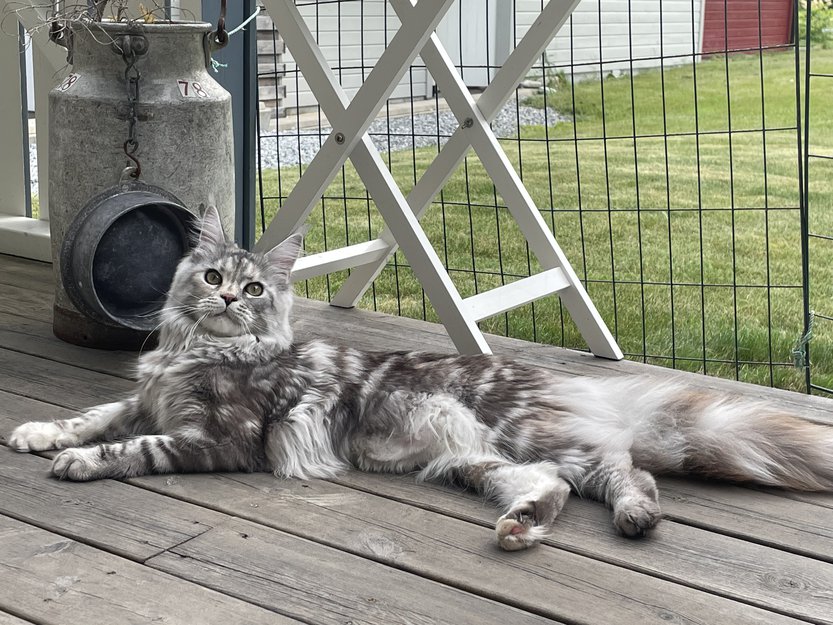 Hoppet ned fra terrassen og og må ha blitt skremt. Sprunget bort fra eiendommen. Er ID merket, men er på ferie og har ikke ID nummer på katten med meg.