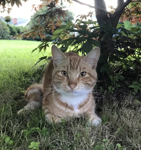 Katten mjauer og er utmagret. Kontaktsøkende. Ung.