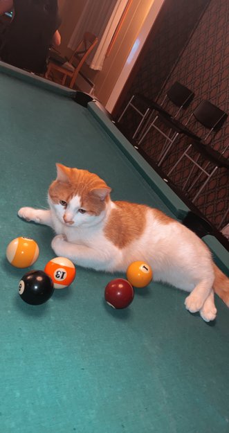 Katten r liten, med en gul flekk under nesa, ser nesten ut som en buse. Utover dette så r han veldig kontaktsøkende