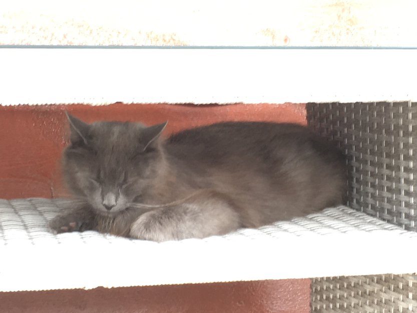 Kjennetegn: lang pels, grå med i sollys litt brun, tynn, ikkje chippet, hannkatt