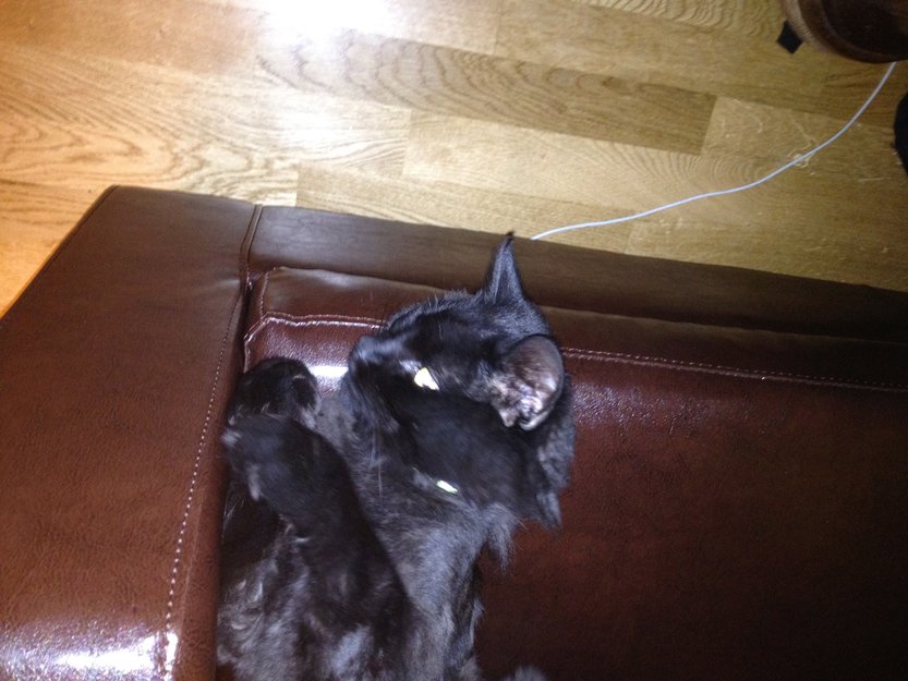 Han har veldig bløt (brun/)sort pels. men ble barbert i våres (pga hårballer) så den er nok ikke vokst helt ut igjen. har lang pels på halen (med noen hvite hår innimellom), og litt under buken og på baken. veldig kosete og lystrer navnet sitt. tatoert "ID" i øret. har aldri vært borte mer enn en halv dag før..