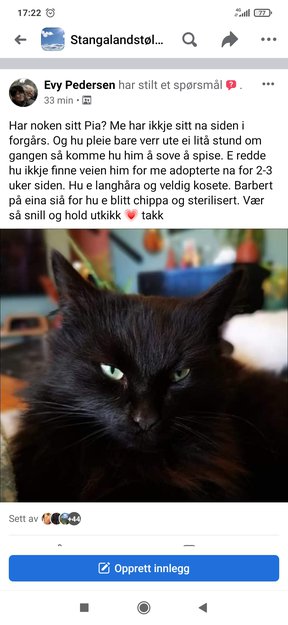 Pia er veldig glad i mennesker og hunder. Hun er kosete. Langt svart hår med ett hvitt værhår som er ganske synlig. På beina har hun ett par hvite hårstrå. Hun er barbert på den ene siden da hun nettopp ble sterilisert og chippet.
