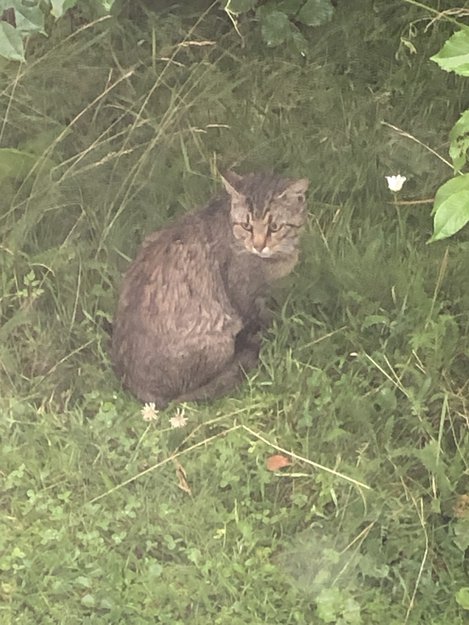 Liten katt har hengt rundt området Granly, Levanger, ved E6 og ned mot Levangerelva i en mnd. Ute i regnet og spiser fuglefrø. Kjempesky og redd, får ikke komme i nærheten av den.