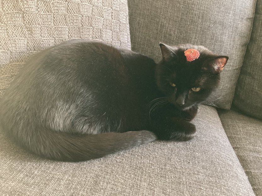 Et par hvite hår på magen og brystet, gule øyne, og brunskjær på pelsen i sola