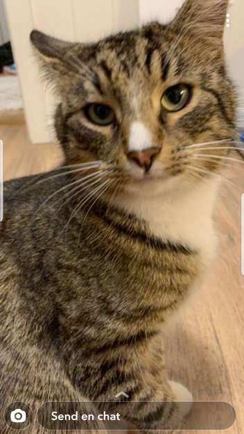 Tigerstripet svart/grå med hvite felter. Han hadde sår/skorper på begge ørene da han forsvant og har det sikkert enda.