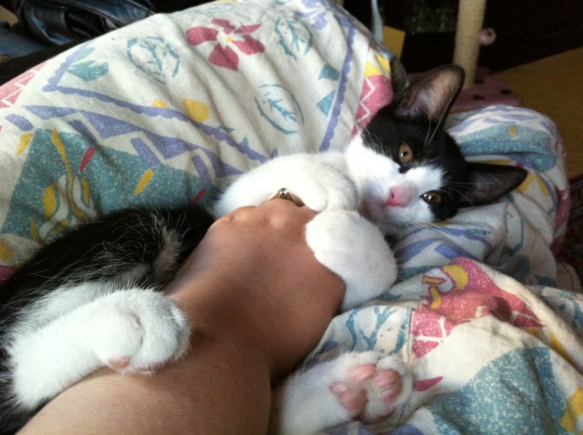 Svart og hvit, veldig kosete og lyder sitt navn Sarah.