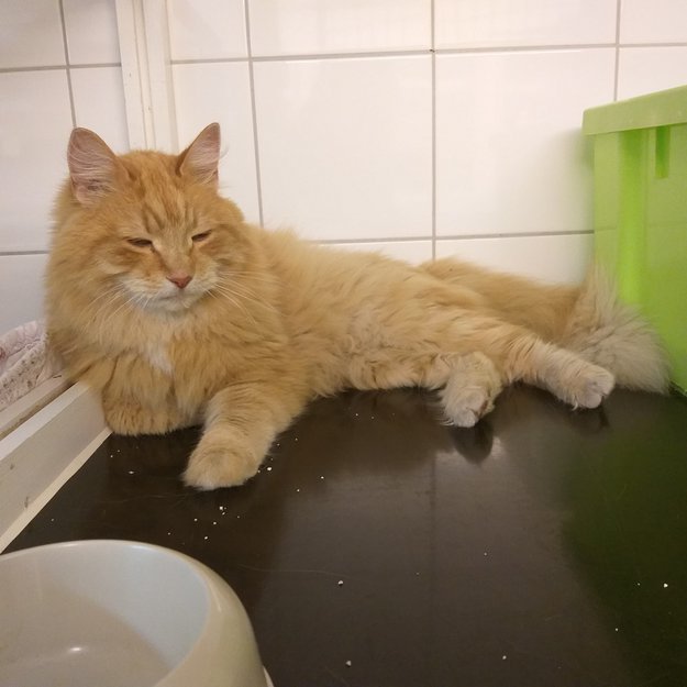 Katten var Iflg Innmelder svært tynn og de trodde han var forlatt. Eier har vært etterlyst tidligere uten respons. Innlevert til Dyrebeskyttelsen 23.07.21