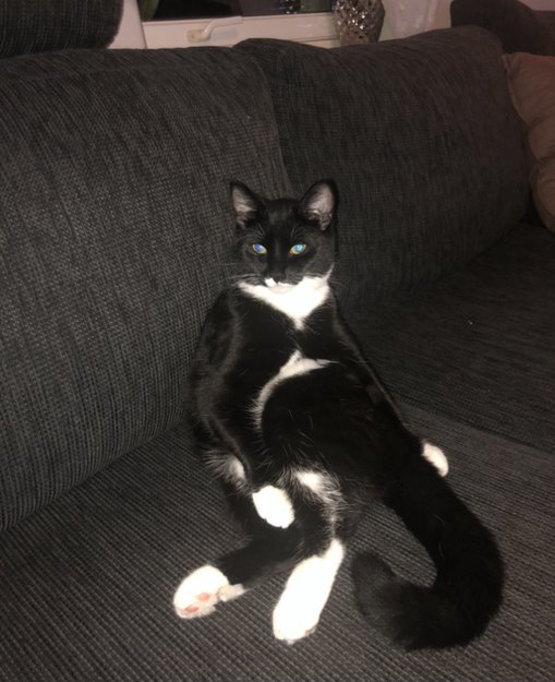 Bildet viser flere av hennes kjennetegn, særlig på snuten at det er litt opphøy i hvitt på den ene siden. I tillegg han hun lange hvite sokker på bakføttene. Under magen har hun et stort felt hvitt foran og et bak, mens det er mer svart i midten.