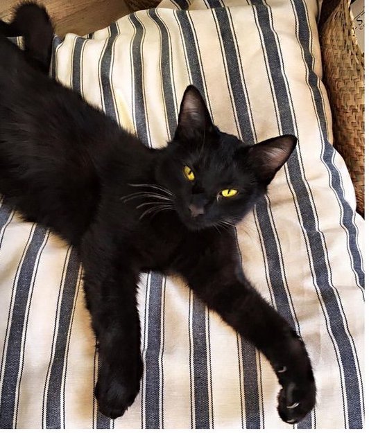 Han er kontaktsøkende, sosial og snill og lager lite lyd. Han har helt svart pels, med kun noen få hvite hår på magen.