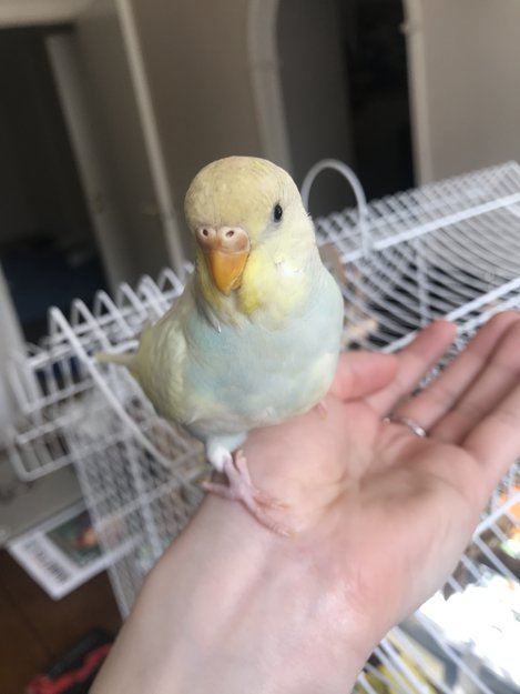 Hun er for det meste lysegul i fjærene. Hun er lyseblå på magen og har en litt sterkere blåfarge under vingene. ID merket på foten er lilla.
