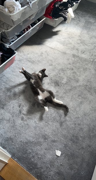 Han har et hvitt område på magen, ellers hvit rundt nesen og noen hvite flekker på beina. Ellers er pelsen grå men når lyset treffer er det brun skjær