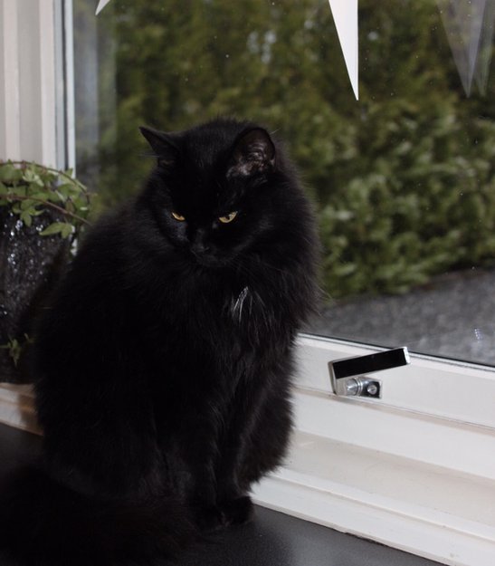 Semilanghåret svart katt, litt hvitt under haka. Ca 9,5 år gammel hunnkatt.