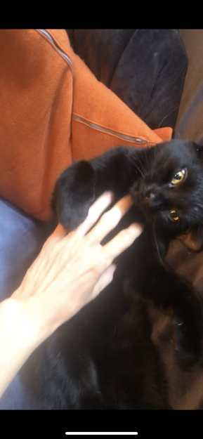 Tynn og halveis liten, helt svart pus som er glad i å mjaue