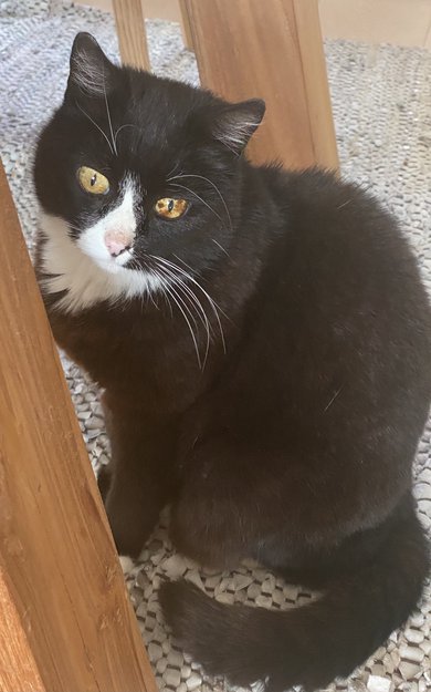 Liten katt. Sort og hvit med orange/brune øyne. Snill og fortrolig.