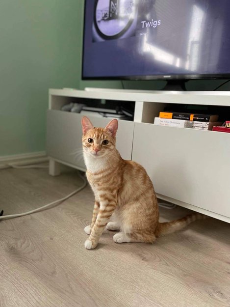 Rød og hvitt katt, en blanding av maine coon og noe annet. Reagerer på å bli kalt Chili eller Pos. Er veldig sosial, men er ikke så vant til å være ute, så han gjemmer seg nok et sted. Er litt mer enn ett år gammel.