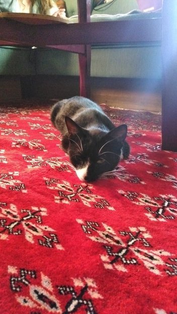 Zorro er svart og hvit, litt over ett år men liten av vekst. Hans beste kjennetegn er at han elsker å sutte på øreflipper:)