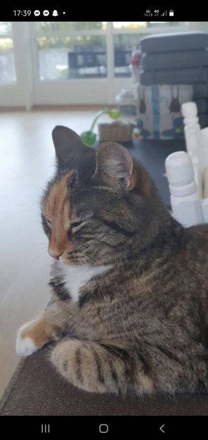 Korthåret grp spraglete, med en oransj trekant mellom øynene. Helt hvit flekk under haken.