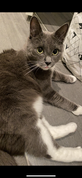Katten er stort sett grå, men har hvite innslag på undersiden av kroppen og på potene. Han har en særegen virvel på ryggen. Han er chippet. Han er veldig sky og redd, og er ikke kjent i området enda.