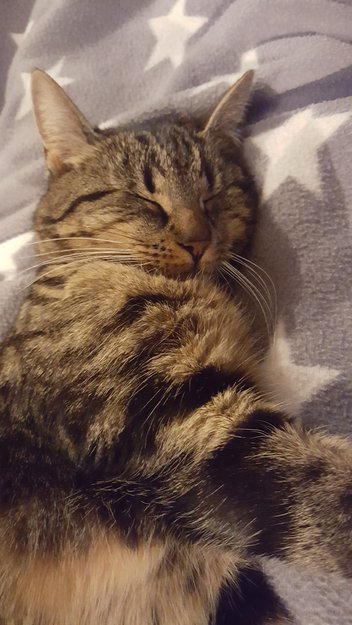 Brede stripete pels. Litt hvit farge på hver pote. Slank hunnkatt.