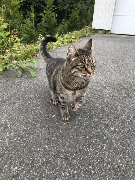 Nydelig hunnkatt søker eierne sine! Hun er utrolig kontaktsøkende, sosial og kosete. Hun fotfølger alle, både små og store. Hun vil inn i hus og hun banker gjerne på ,samtidig som hun majuer litt.