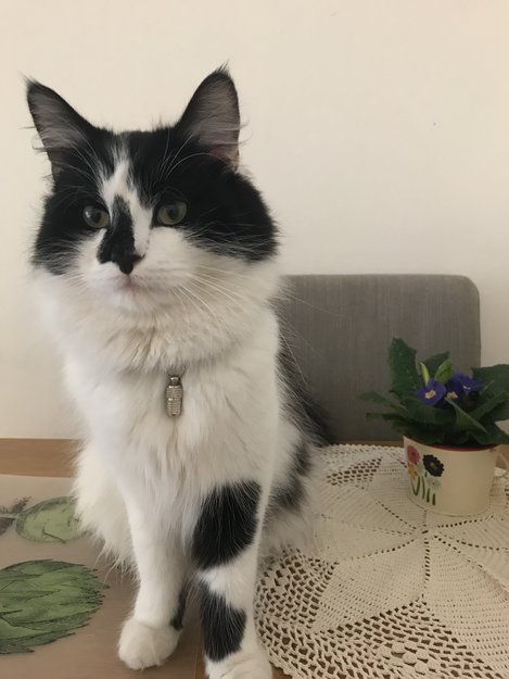 Relativt liten langhåret sort og hvit katt som er veldig sosial og kosete med mennesker. Mjauer for å få oppmerksomhet eller si ifra om ting.