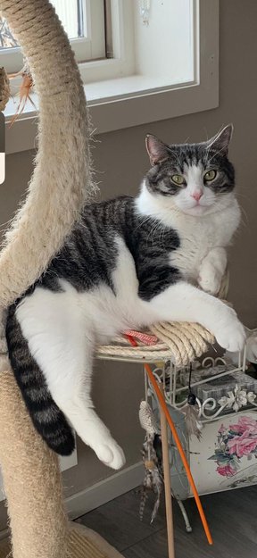 Han har en liten kutt i det ene øret på typen og har bare en svart flekk under poten