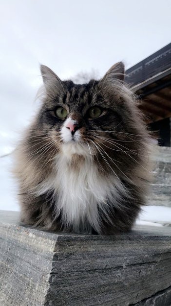 Halv skogkatt, brun, svart,grå spraglete. Hvite poter og hvit krans på brystet. Hvit på magen. Rosa og hvit nese.