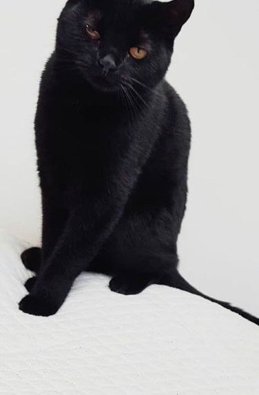 Huskatt, som er kvart perser. Har ganske tykk svart kort pels. Helsvart. Har Orange øyne, typisk persertrekk i ansikt, men ikke flat nese. Sosial, nokså kontaktsøkende.