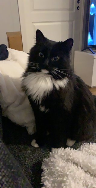 Det er en stor hannkatt. Hvit på potene, bryst, mage og hake. Han er ID merket og kastrert.