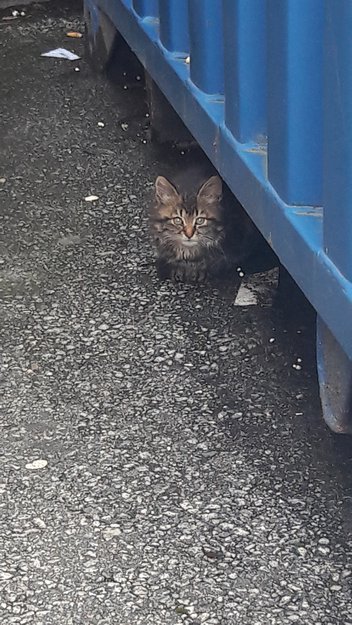 Så liten kattunge litt bortforbi inngang til mega i Solakrossen nå nettopp. Så ut som den var litt lost men så ikke skadet ut. Vanskelig å komme nær katt for å se om noen eier den pga den sprang når jeg nærmet meg. Første gang jeg ser den og jeg har ikke mulighet til å ta meg av den.