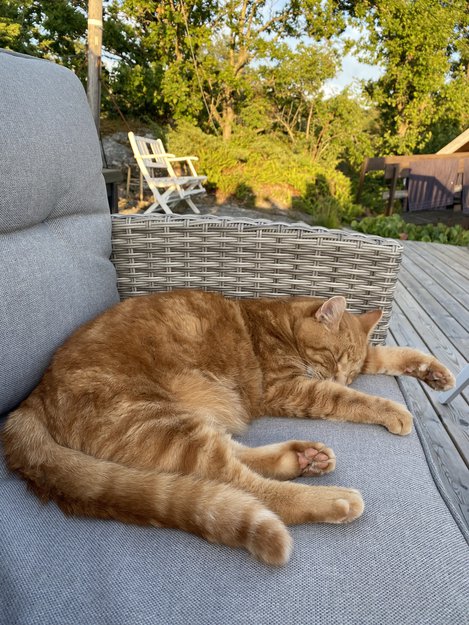Oppholder seg normalt kun ved hytta, benytter innedo og får måltider x3/dag. Er en innekatt, men har vært her tre sommere.