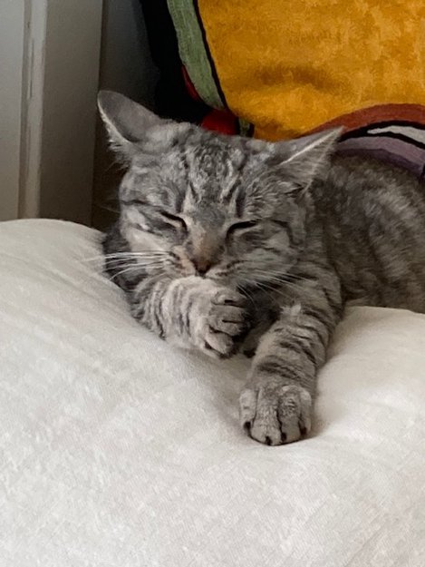 Ett år gammel, litt sky katt. Stripete, hvit på magen. Ca en meter lang når hun strekker seg ut.