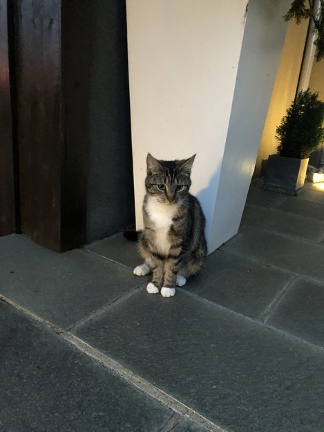 Gråspraglet med hvite poter. Liten av størrelse og ca 1,5 år.