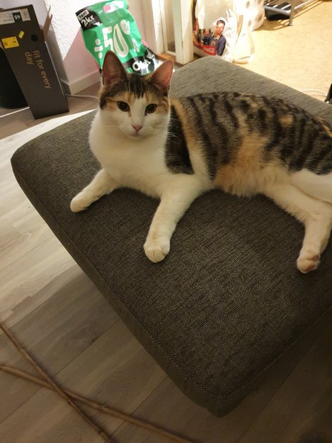 Hun er 1 år gammel så er ikke veldig stor. Tricolour farget med nesten helt hvit mage. Hun er sjenert og er ikke så glad i folk. Nakken er halvt svart og halvt brun